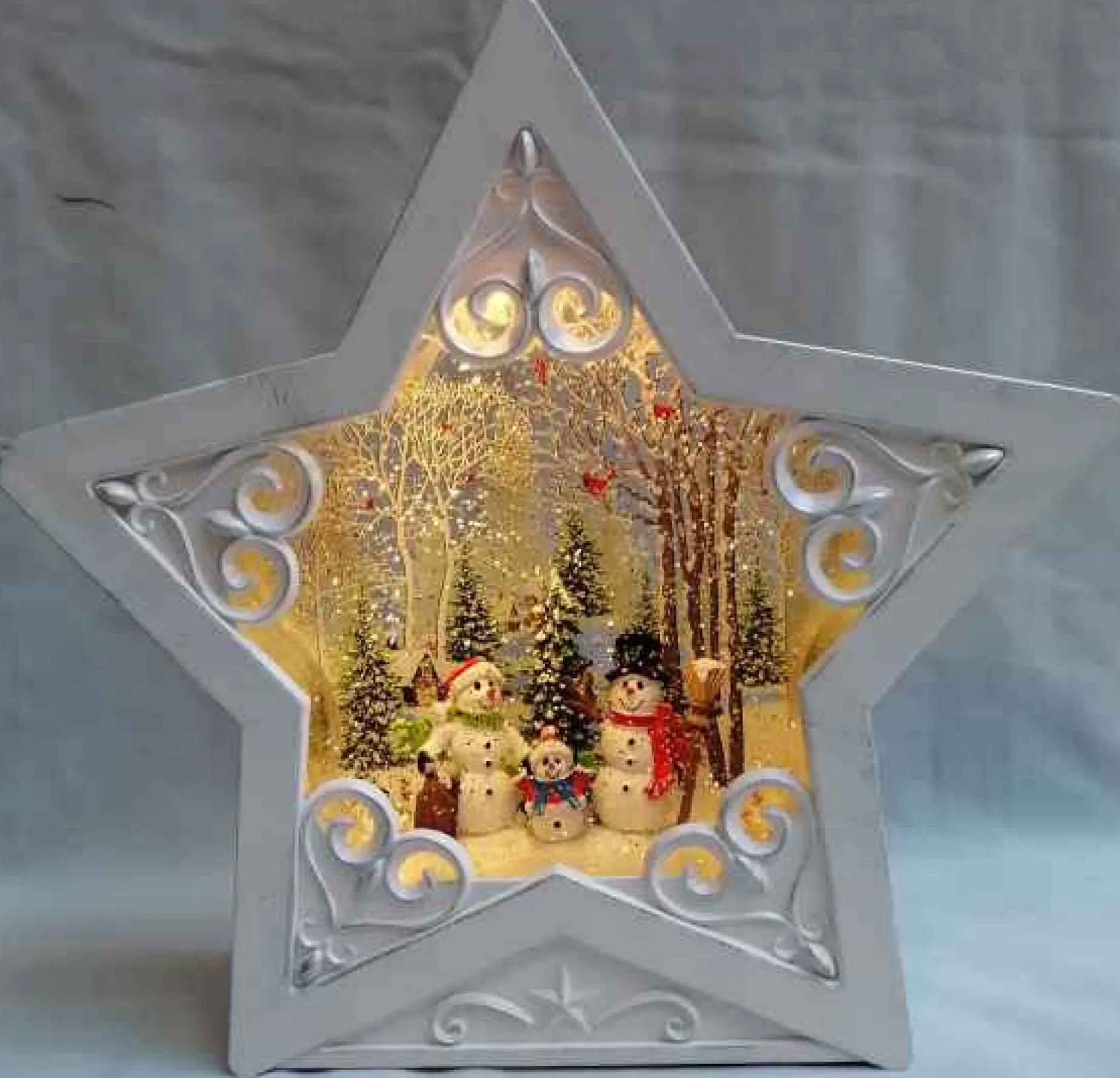 White Star Scroll Design With Led Warm White Light Up Snowman Family Scene Spinning Glitter Waterglobe