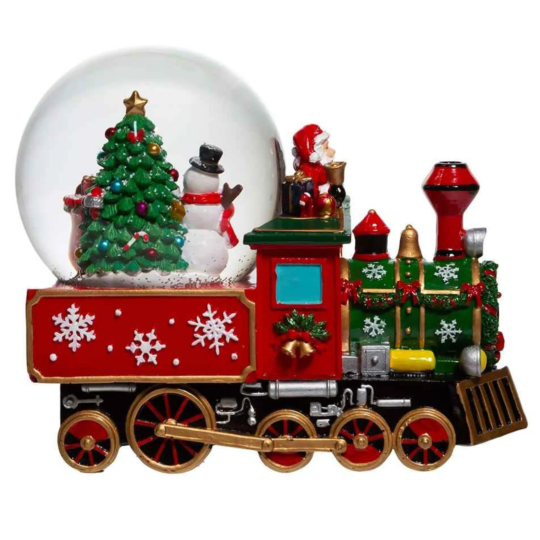 Kurt Adler’s 120Mm Musical Santa Driving Train Water Globe Is A Festive Addition To Any Home Or Office Holiday Decor. It Features A Water Globe With A Snowman, Toy Filled Sleigh And A Decorated Christmas Tree Atop A Red And Green Train With White Snowflake Accents. Santa Is Driving The Train And Ringing A Bell. This Water Globe Plays The Song We Wish You A Merry Christmas.