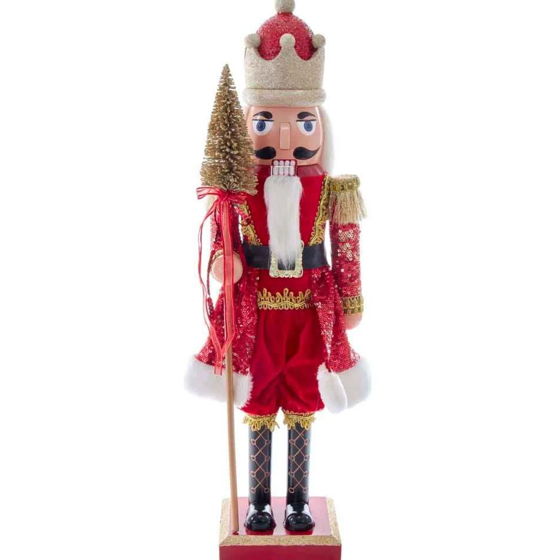 This Kurt Adler 24-Inch Plastic Red And Gold King Nutcracker From Kurt Adler Is A Festive And Fun Way To Add To Your Holiday Decor! Featuring A Nutcracker In A Soldier Costume With Shoulder Tassels And Sequins. He Is Holding A Staff That Is Topped Off With A Gold Tree While Standing On A Red And Gold Base. This Nutcracker Is The Perfect Addition To Any Classic Holiday Decor!