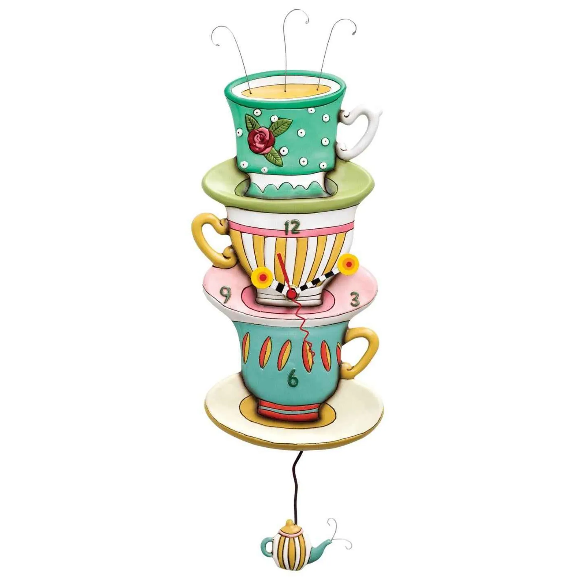 There Is Always Time For Tea And Cute Cups! The Spot Of Tea Clock Features 3 Sets Of Colorful, Patterned Cups And Saucers Stacked On Top Of Each Other. The Swinging Teapot Pendulum Is Steaming And Ready To Pour Water For Tea Time!