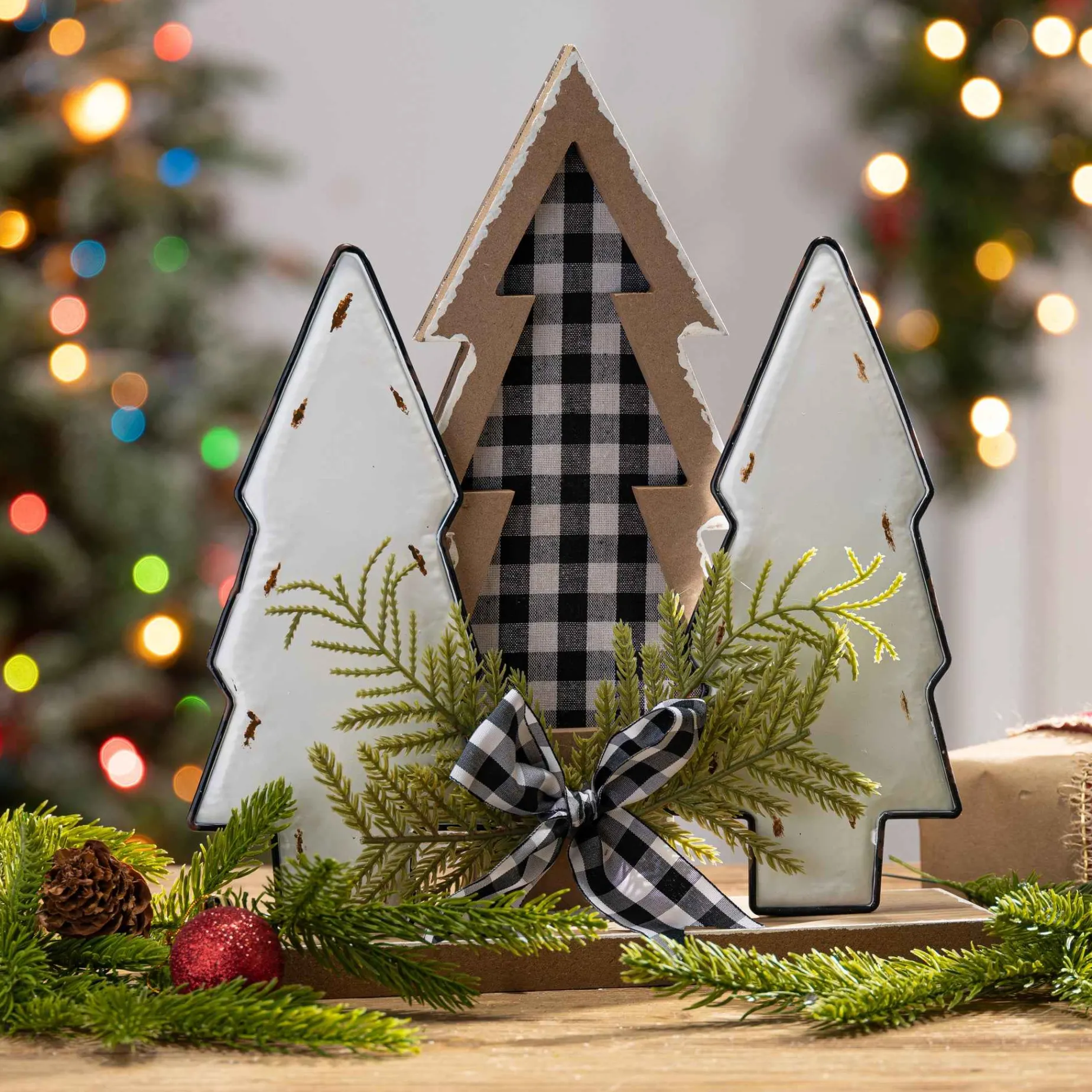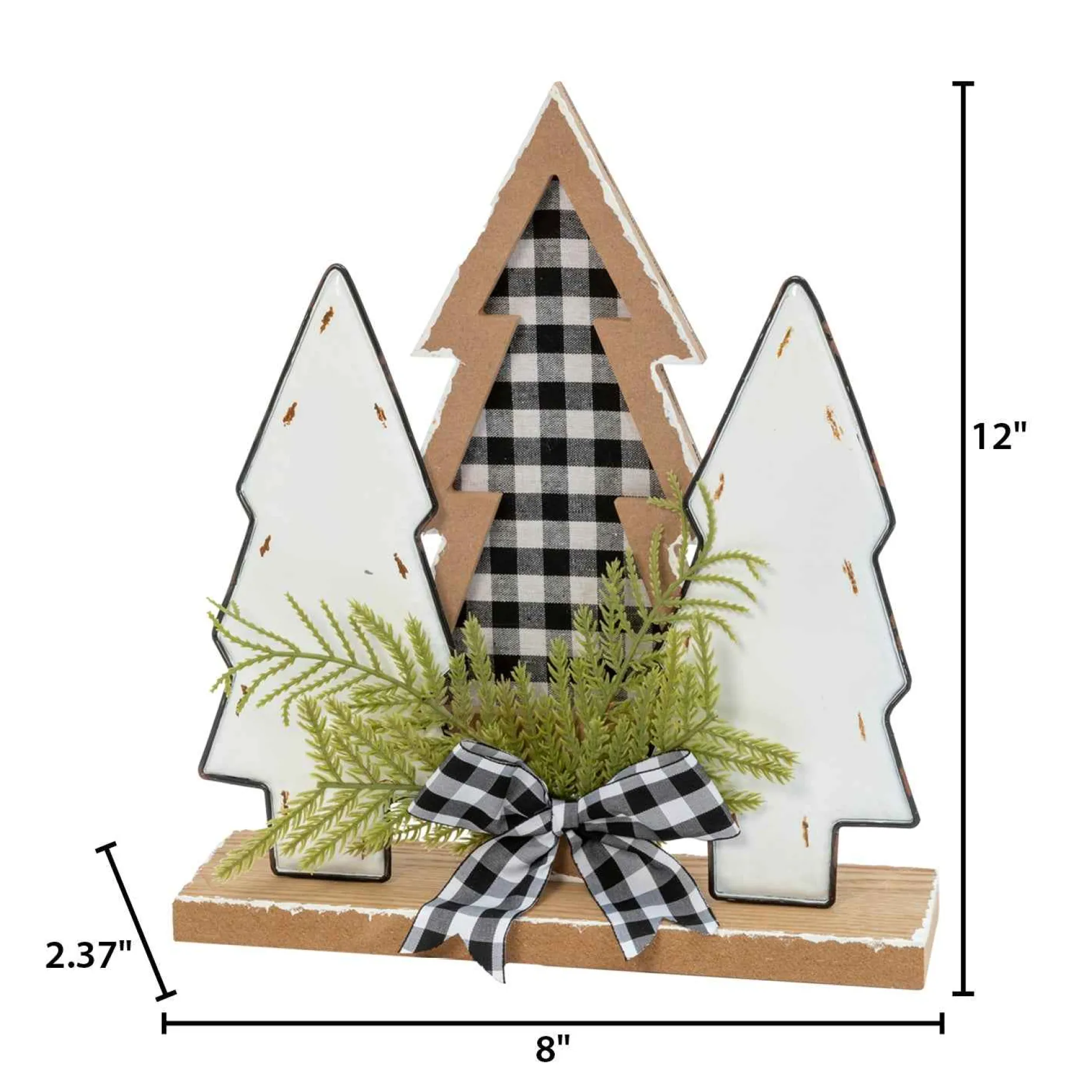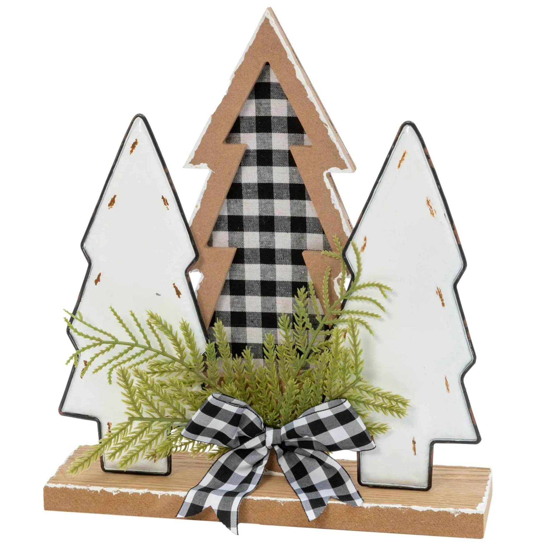This Tasteful 12-In High Trio Of Winter Trees Will Be A Welcome Accent To Any Holiday Decor.Made Of Wood, There Are Two White Painted Trees Framing A Wood Tree With Black And White Buffalo Plaid Inlay.Standing On A Natural Wood Base, Winter Greenery And A Plaid Bow Ad A Note Of Added Interest