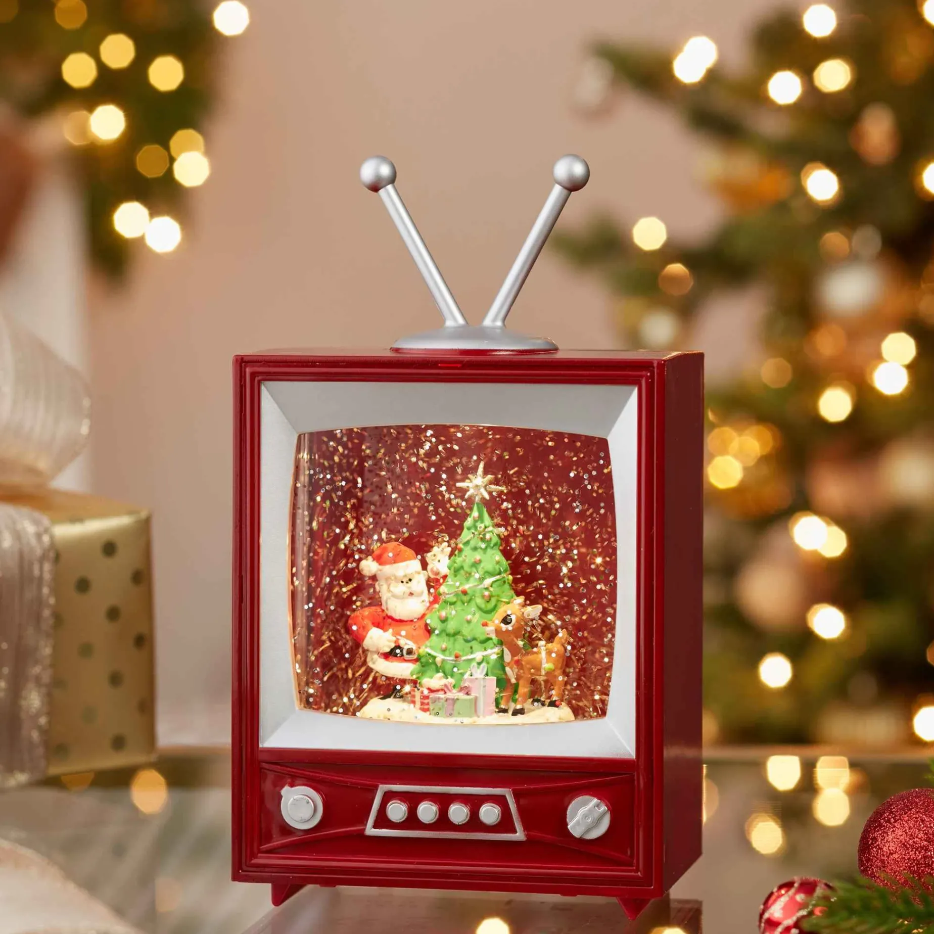 This 8.5-Inch Battery-Operated Rudolph And Santa Musical Tv Table Piece From Kurt Adler Is A Charming Addition To Any Holiday Decor. This Television Water Lantern Features Santa And Rudolph With A Decorated Christmas Tree And Presents With An Antenna. When Switched On, It Plays The Song “Rudolph The Red-Nosed Reindeer”, A Spotlight Falls On The Tree And Glitter Swirls Around For A Snowy Scene. This Item Requires 3 Aa Batteries (Not Required).