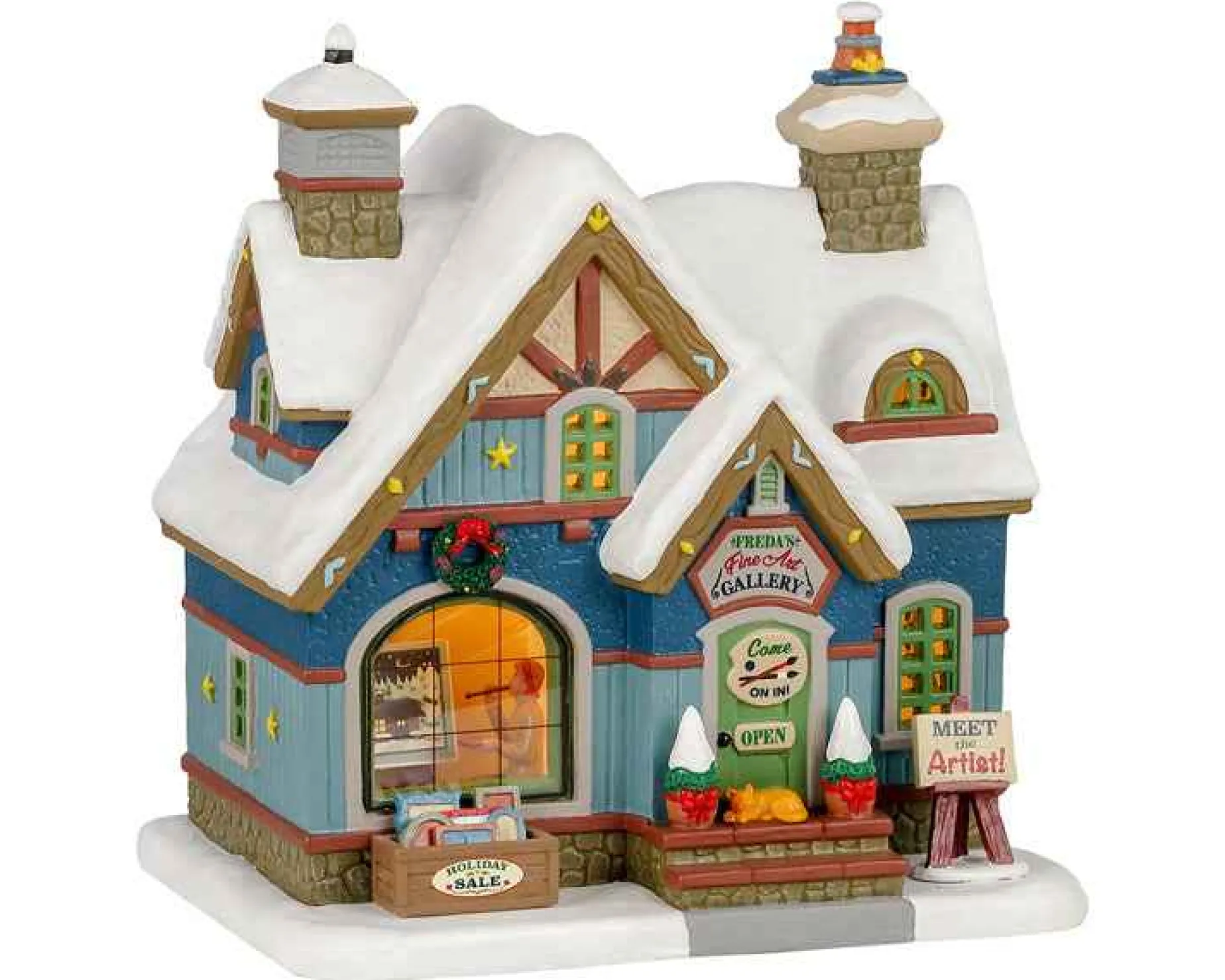 Freda’s Fine Art Gallery Is A Must Visit. This Quaint Gallery Is Painted In Shades Of Blue, With Decorative Yellow Stars Adorning The Exterior Walls. It Clearly Snowed Recently, As The Roof And Ground Are Covered In Snow. Through The Front Lighted Window, You Can See An Artist Finishing Up A Beautiful Winter Painting. A Sign Welcomes You To Come On In And Meet The Artist Or Take Advantage Of The Holiday Sale!