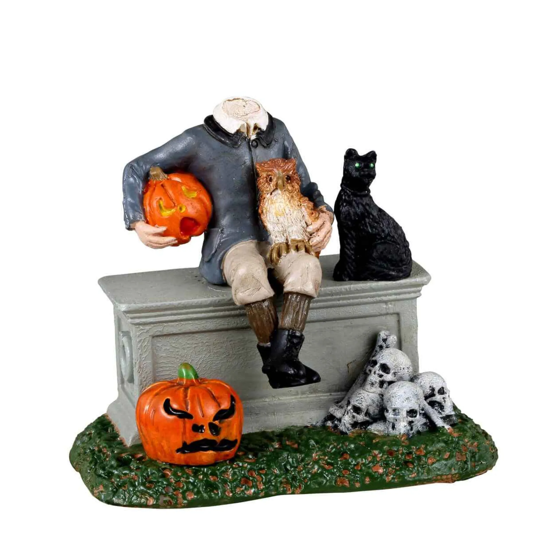 This Spooky Town Figurine Takes Losing Your Head To A Whole New Level. Sitting Atop A Coffin That May Or May Not Contain His Missing Head, This Headless Fellow Is Accompanied By A Cat And Owl Who Don’T Seem To Be Doing Much To Help Him Find His Missing Head. Perhaps He Is Just Taking A Break From Searching And Is Contemplating Using The Jack O’ Lantern He Holds As His New Head. After All, Anything Can Happen In Spooky Town.